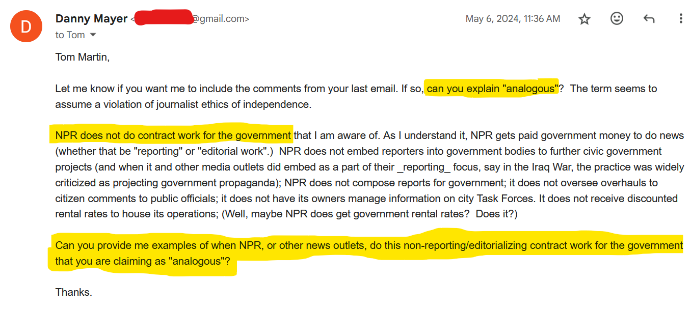 In his flip-flop email, Martin raised the example of federal subsidies that are paid out to NPR for its work reporting and editorializing the news. Martin then compared these NPR subsidies to CivicLex winning city contracts to analyze city boards, overhaul citizen comment process, and manage key chunks of the city’s Master Planning documents.