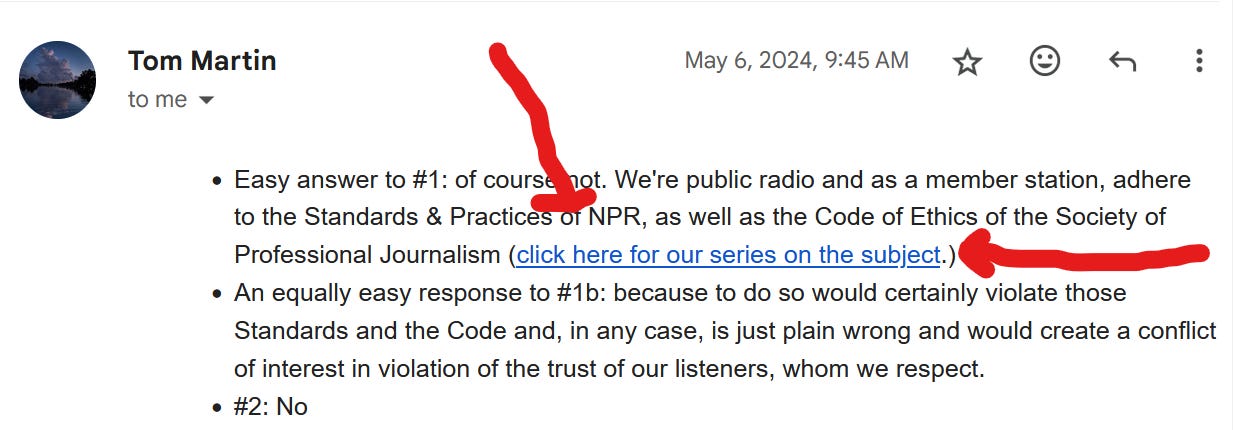 First, as somebody working to get content for a story, I needed to figure out what to do with Martin’s new statements. The new view—CivicTown is ethically all good because of analogous similar firewalls to NPR that are unchallengeable—represented a complete flip from Martin’s initial on-the-record comments that “to do so…is just plain wrong and would create a conflict of interest in violation of the trust of our listeners, whom we respect” (emphasis mine).