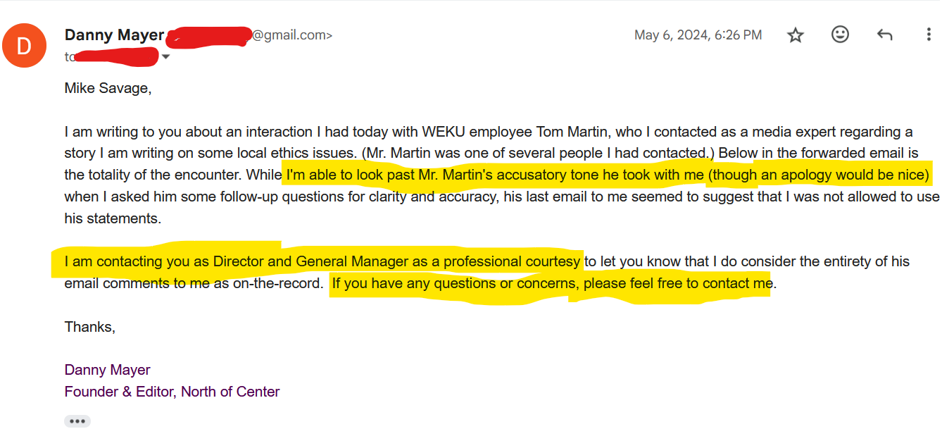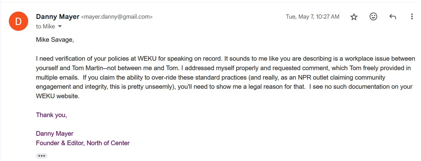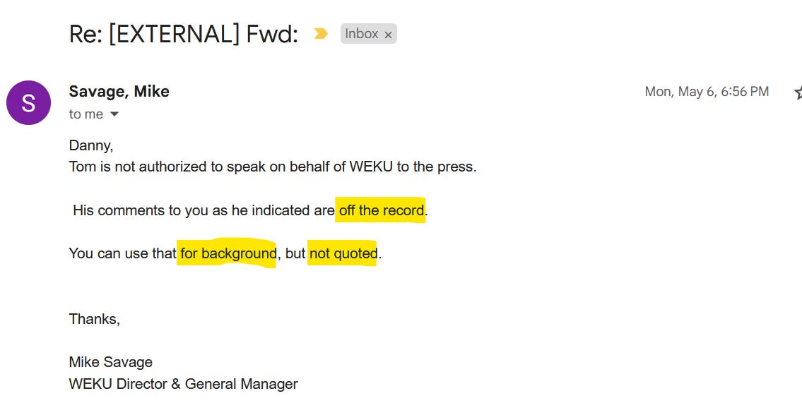 The WEKU manager claimed that, like a child not allowed off his NPR journalism leash, Tom Martin was not authorized to speak. All of the Eastern Standard chief’s comments were therefore off the record and/or on background. (Humorously, Savage’s ultimatum mixed together at least two separate journalism standards for source attribution. I attempted to email him back for clarity, but he ghosted me after a “no comment.”)