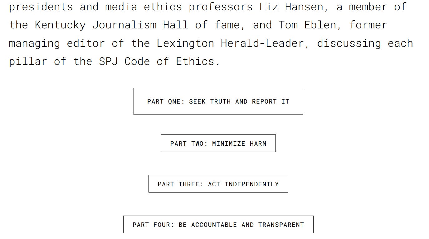 Eblen’s Eastern Standard co-host for the 4-part series on journalism ethics was former EKU professor Liz Hansen. (Applicable ethics episode: Part one: Seek Truth and Report It.)
