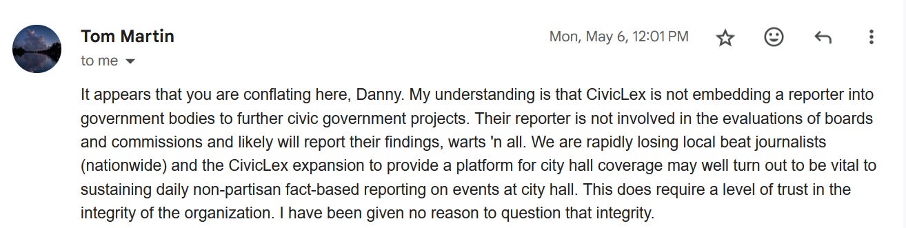 It appears that you are conflating here, Danny. [1] My understanding is that CivicLex is not embedding a reporter into government bodies to further civic government projects. Their reporter is not involved in the evaluations of boards and commissions and likely will report their findings, warts ‘n all. [2] We are rapidly losing local beat journalists (nationwide) and the CivicLex expansion to provide a platform for city hall coverage may well turn out to be vital to sustaining daily non-partisan fact-based reporting on events at city hall. [3] This does require a level of trust in the integrity of the organization. [CONCLUSION] I have been given no reason to question that integrity. [Brackets mine.]