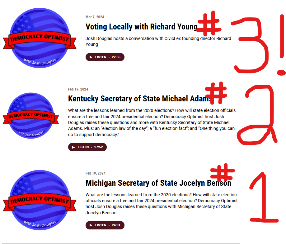 Thanks to a reader who contacted me for a mis-statement. I had originally identified the first two speakers in the Democracy Optimist podcast series as "Attorneys General." These were in fact Secretaries of State for Michigan and Kentucky. I made the change in the text.