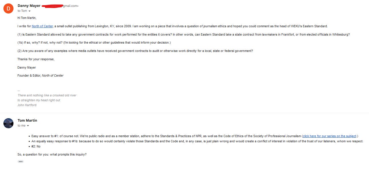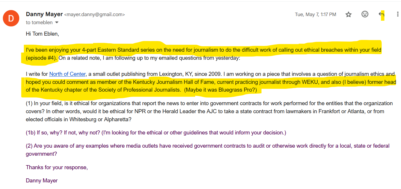 Former Herald Leader columnist Tom Eblen was cited by Martin in his original email declaring it “just plain wrong” for media outlets to engage in government contracts. Eblen recently cohosted a 4-part Eastern Standard series on…journalism ethics. The very topic for which I had contacted Martin. (Applicable ethics episode: Part Three:Act Independently.)