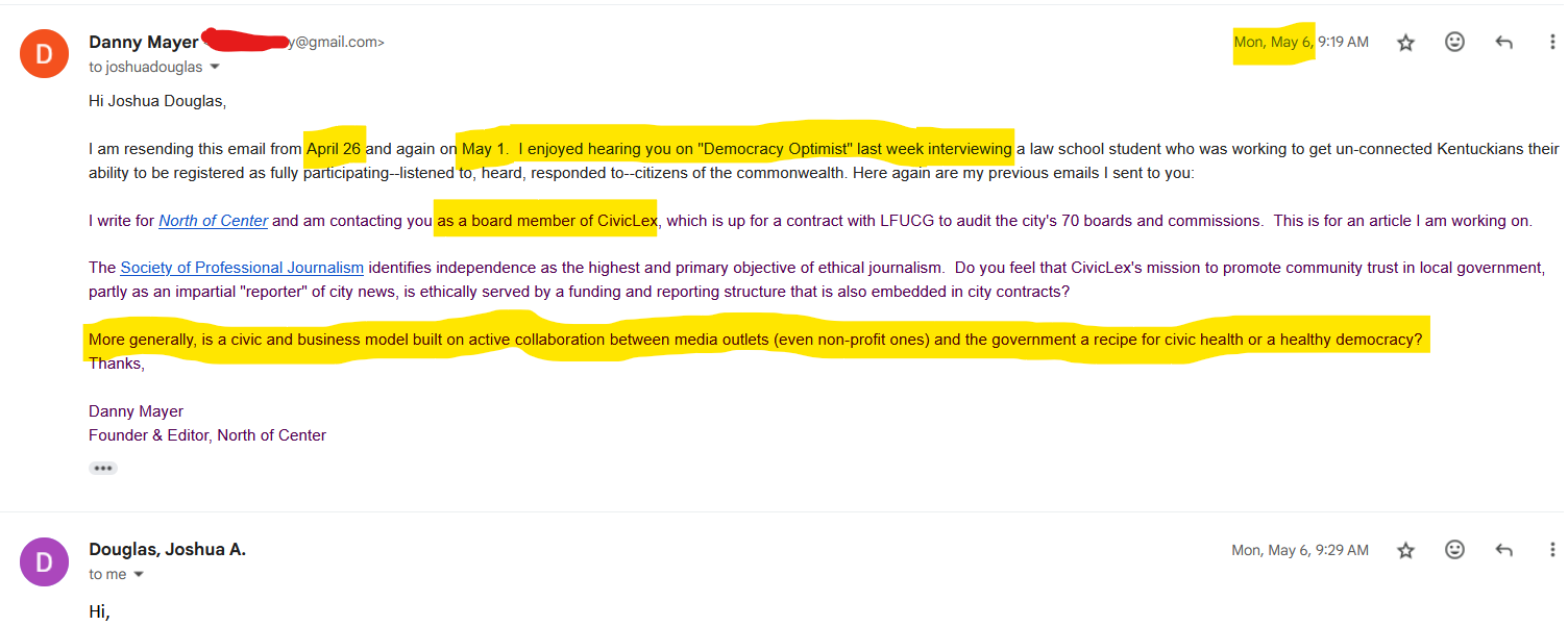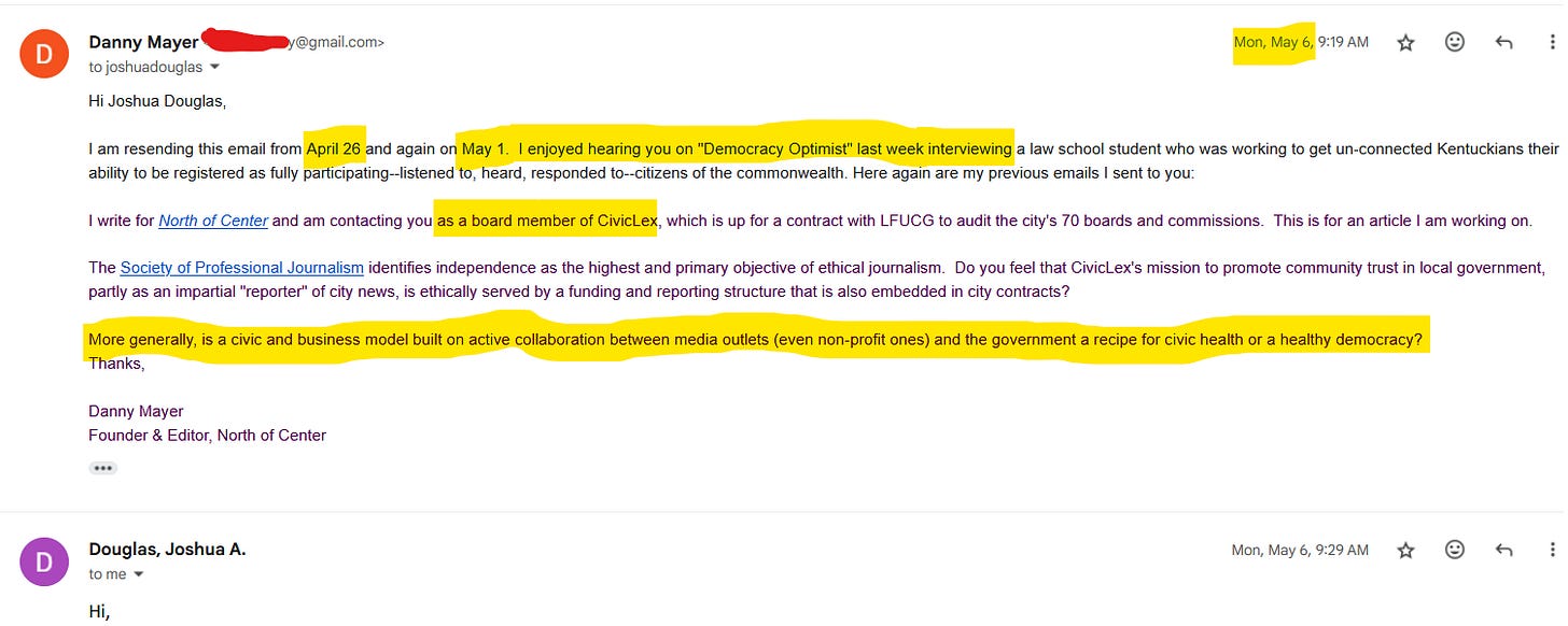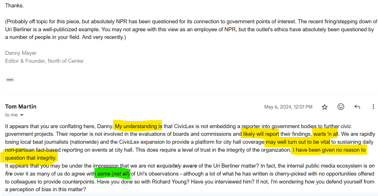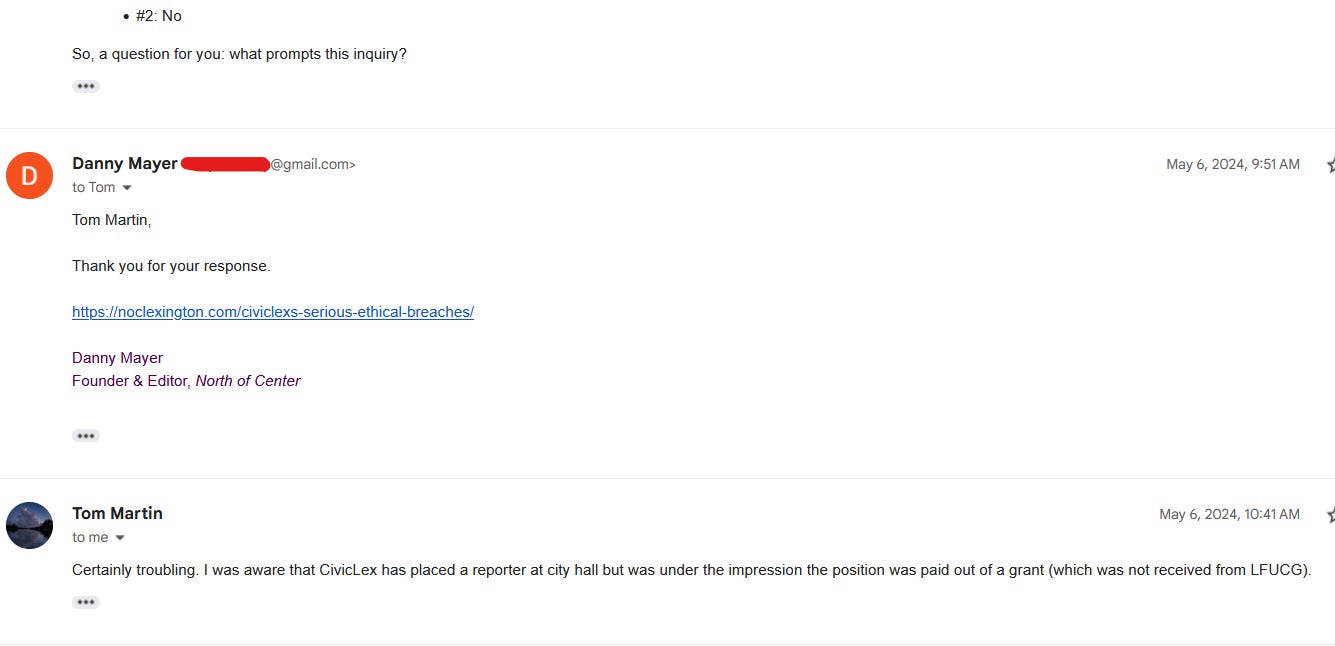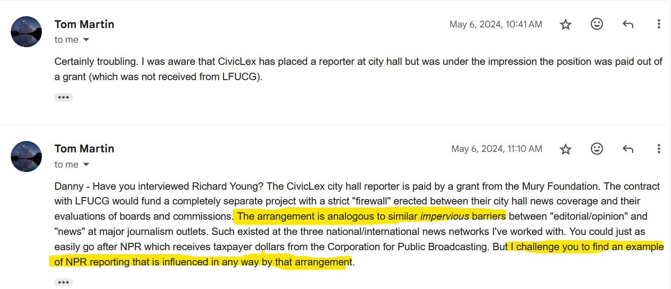 Danny—the CivicLex arrangement was good, Martin argued, which I’d have known if I had contacted CivicLex CEO Richard Young. The CivicLex reporting came from a separate grant-funding stream. There was a “strict ‘firewall’” between its city contract work and its city reporting work.