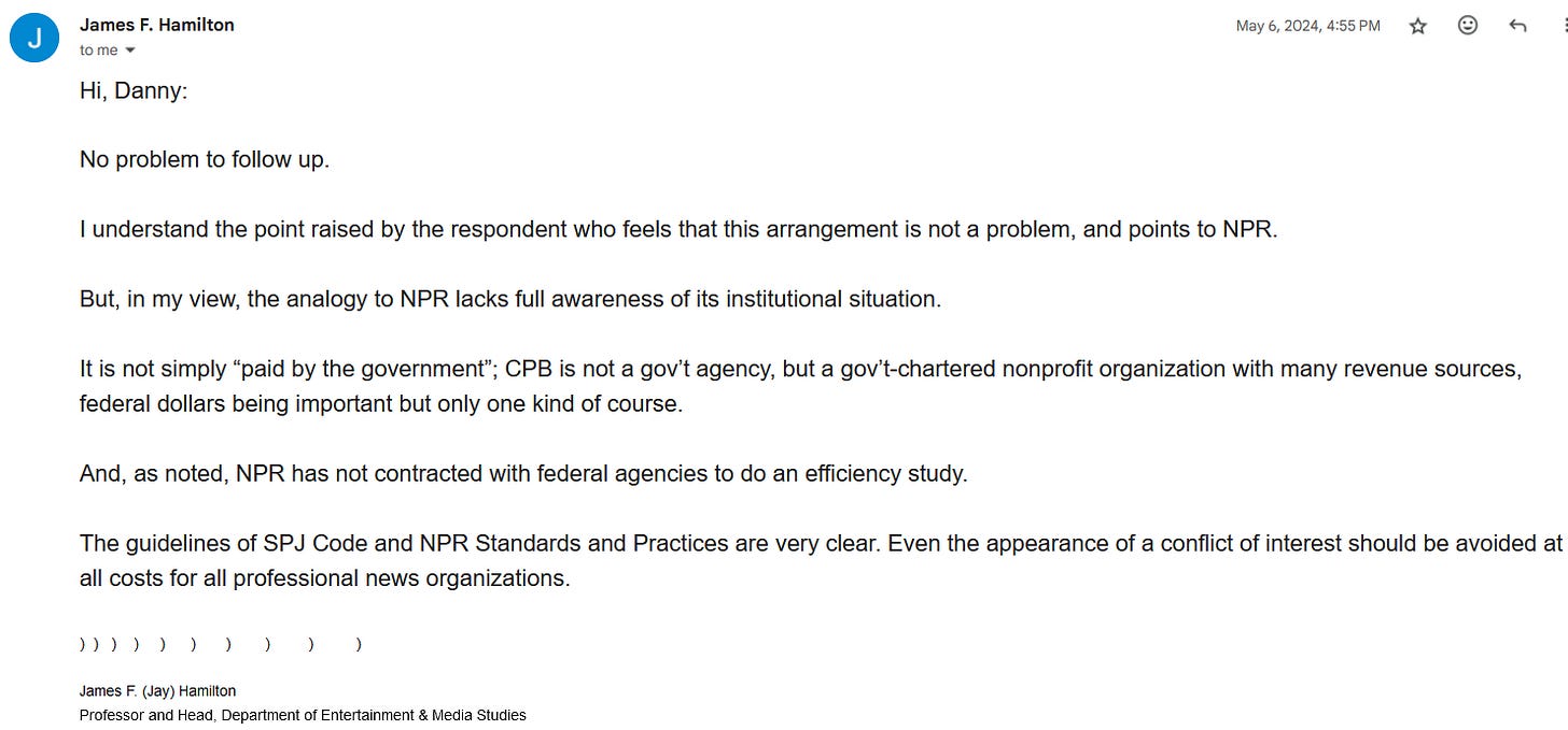 “The guidelines of SPJ Code and NPR Standards and Practices are very clear,” Hamilton notes. “Even the appearance of a conflict of interest should be avoided at all costs for all professional news organizations…And, as noted, NPR has not contracted with federal agencies to do an efficiency study.”