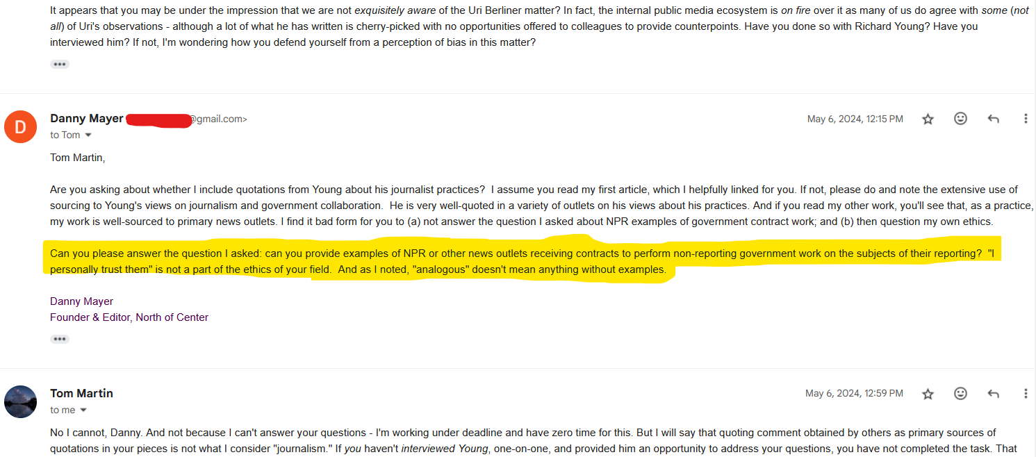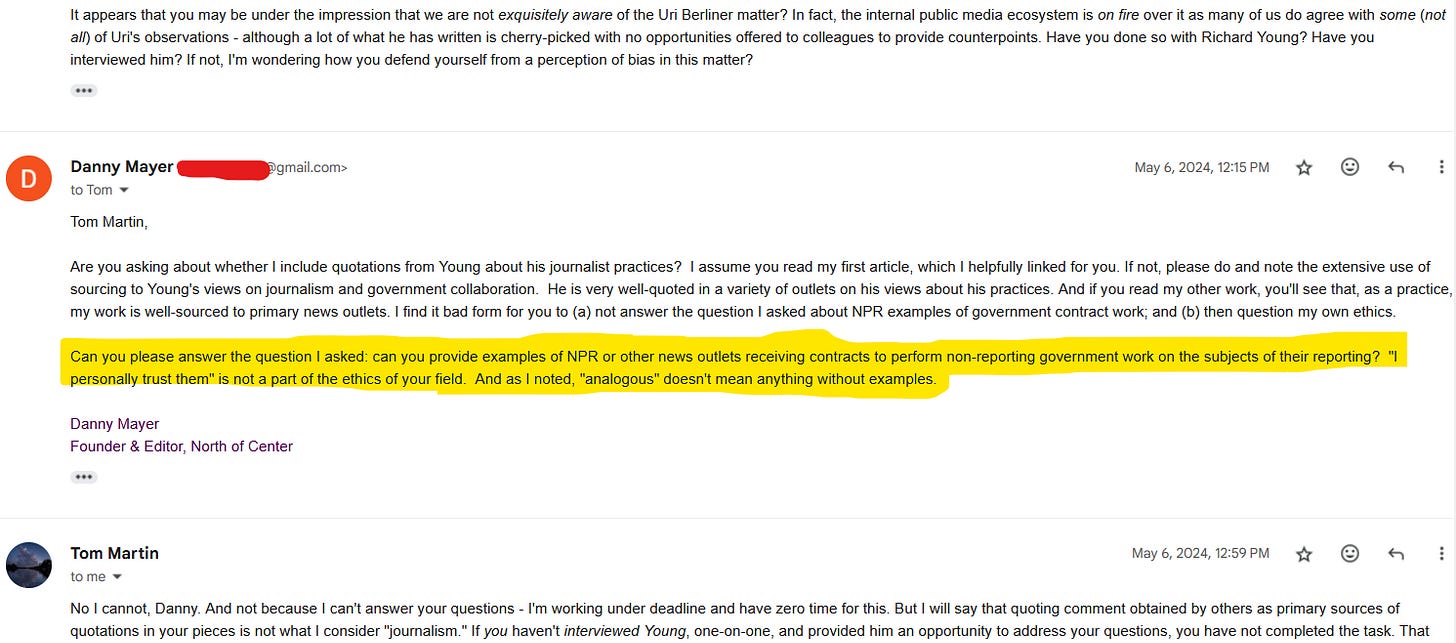 Though, I should also faithfully record here: across more than 5 follow-ups, Martin never once provided an “analogous” example of a serious news organization that took contract money from the same government it was covering.